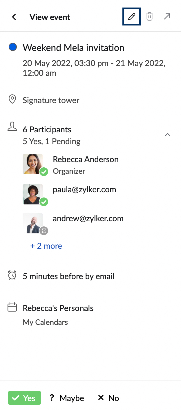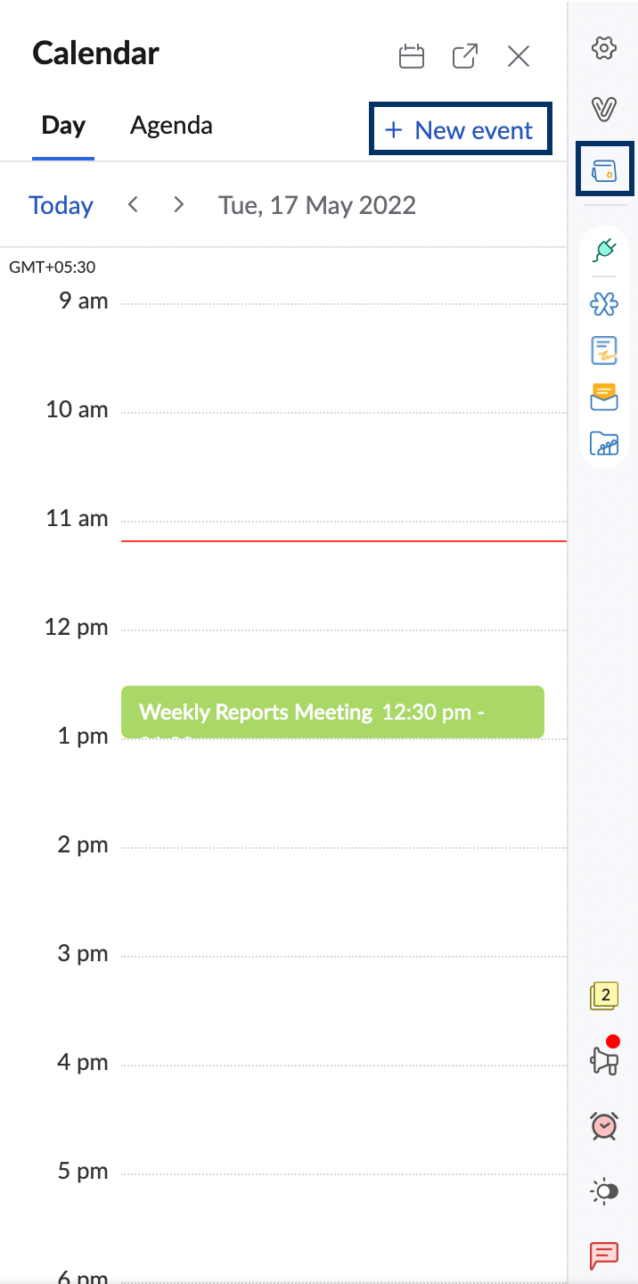 Zoho Calendar in the Mail-suite applications helps you to better schedule your days without having to close your mailbox. You can view your events, events that you're a part of, be reminded of events, and so on with the Calendar application. The Zoho Calendar integration, in addition to the app, allows you to contextually create events from the emails you receive. The RHS widget can also be used to get a quick view of the day's events and the month's agenda. You can also quickly create and edit events using the widget.