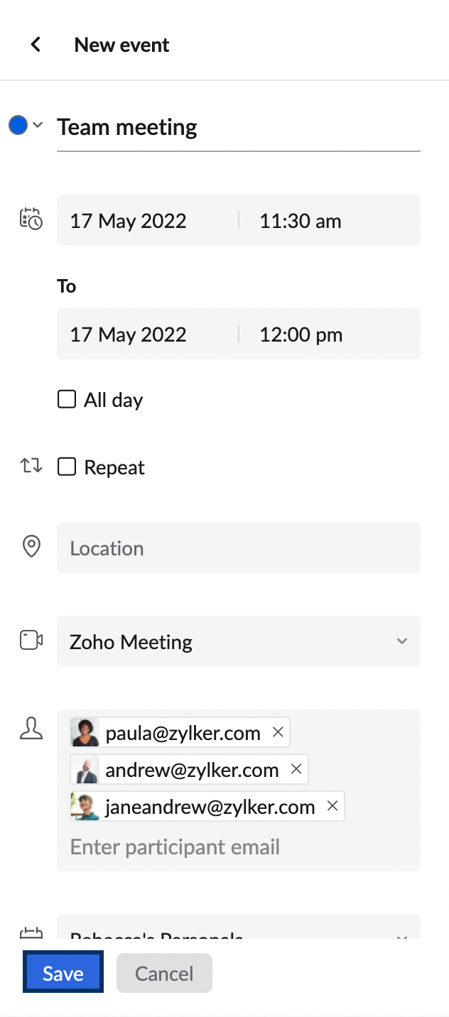 You can meet all your scheduling needs using Zoho Calendar application from the left pane.